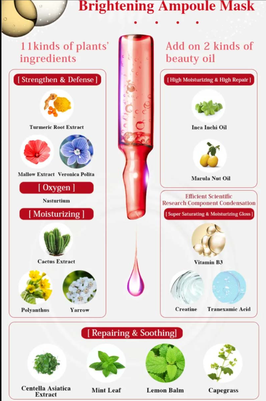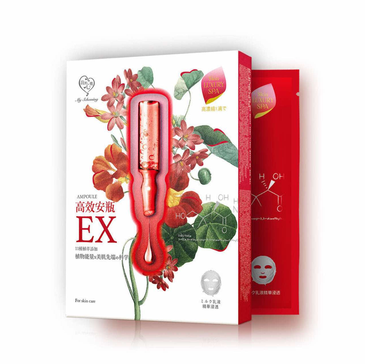 MY SCHEMING Extra Brightening Ampoule Mask, High-penetration lightweight beauty essence gel contains 11 carefully selected plant extracts + 2 luxurious beauty oils, with an ultra-fine fiber cloth mask that provides a smooth, silky feel like milk. It deeply delivers highly concentrated essence nutrients. Benefits: concentrated moisturizing and hydrating complex, improves skin moisture content and elasticity. Sales focus: ultimate skin rescue!